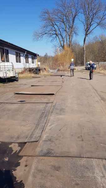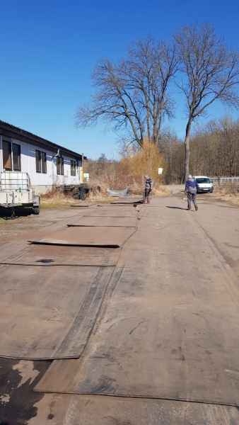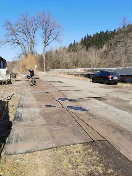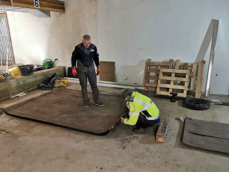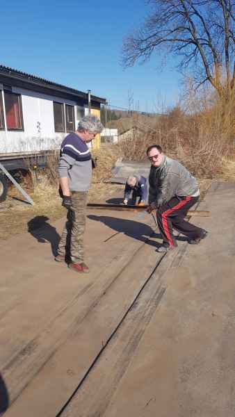 - Die großen Bahnen der Gummimatten wurden in etwa 2,7m lange Stücke zerlegt und angefangen diese in den Schießstand zu transportieren.